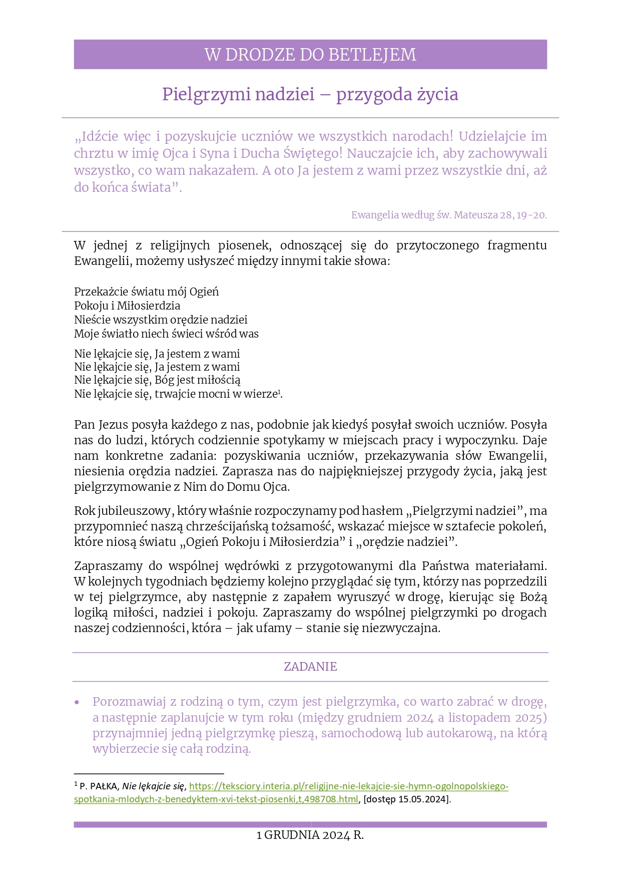 Rozważania na 1 grudnia 2024 r. – „Pielgrzymi nadziei – przygoda życia”
