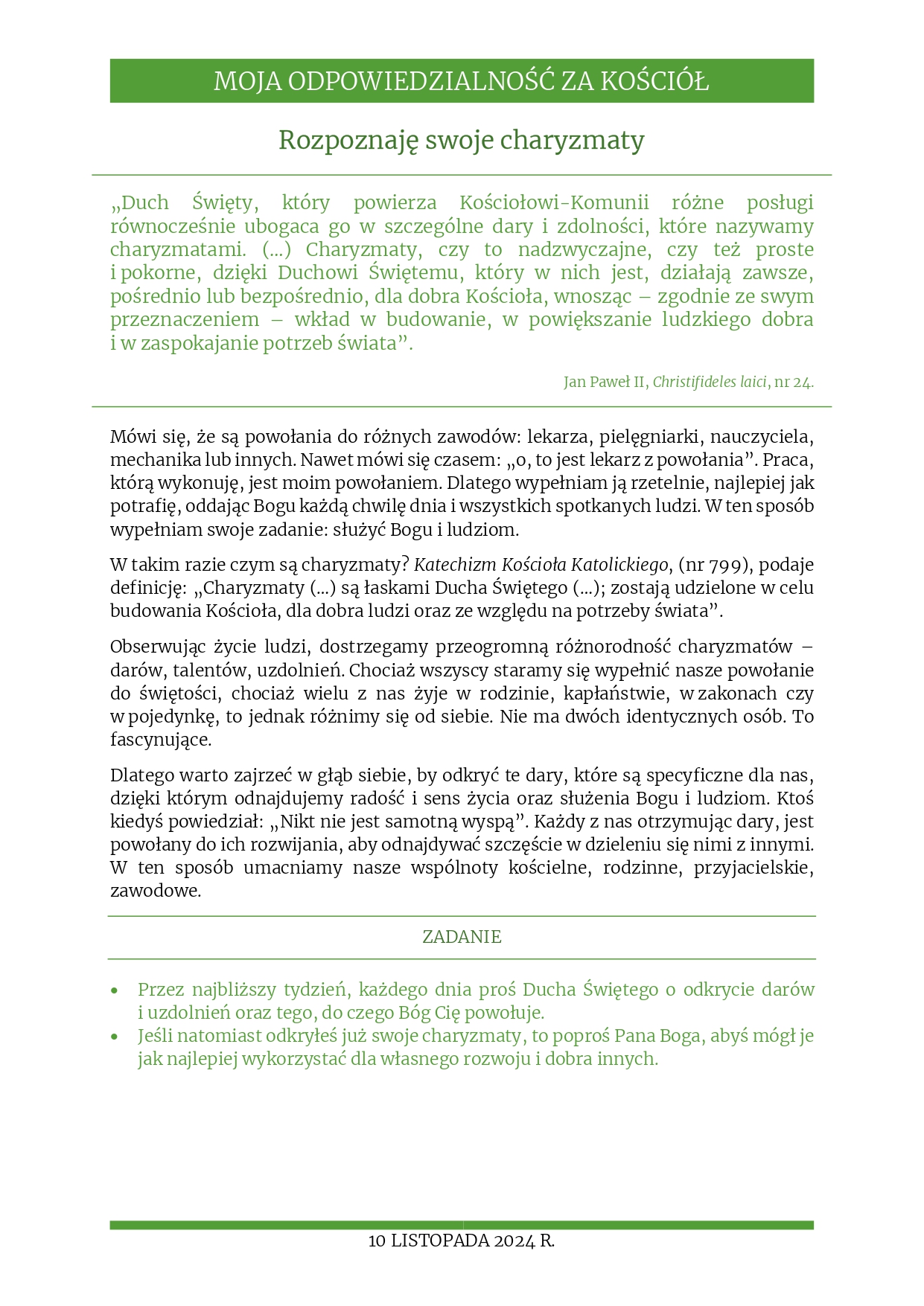 Rozważania na 10 listopada 2024 r. – „Rozpoznaję swoje charyzmaty”