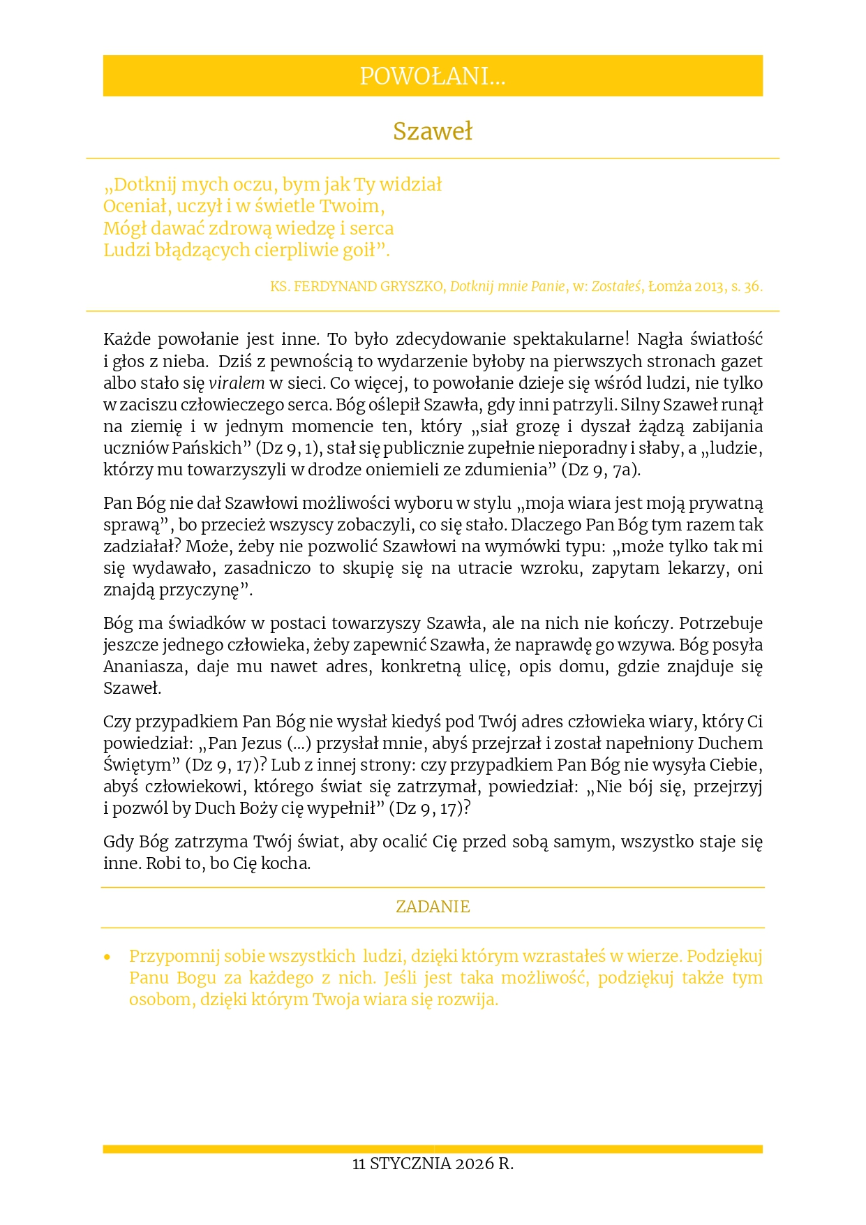 Aktualności, Poczta parafialna Poczta parafialna – rozważania na 11.01.2026 10 stycznia 2026 / Informacja przesyłana z Kurii Diecezjalnej, w której poruszane są różne ważne materiały związane z tegorocznym tematem duszpasterskim dla Polski o Kościele. Poniżej kolejny z takich materiałów, bardzo zachęcamy do lektury. Rozważania na 11 stycznia 2025 r. – „Szaweł” 19_Materiały_dla_rodziny_11.01Pobierz