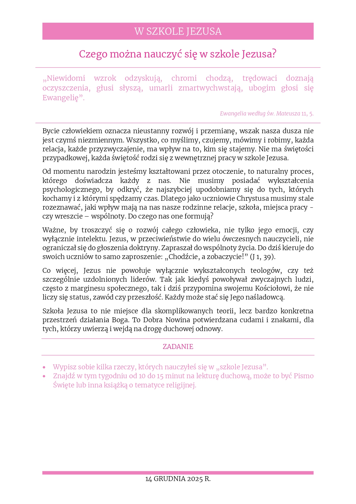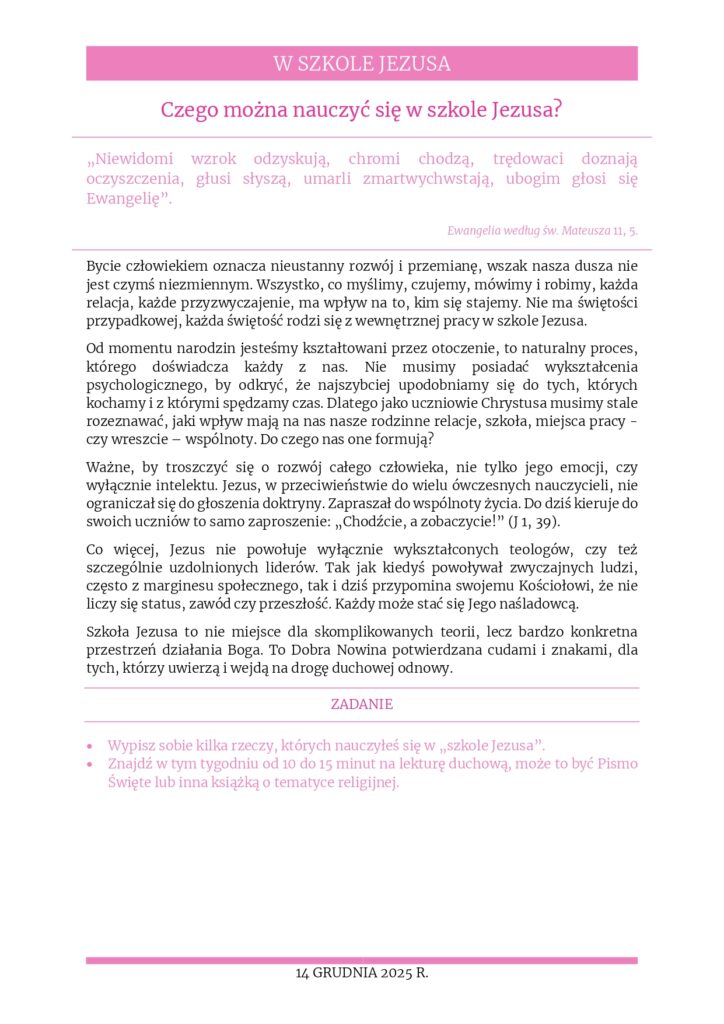 Rozważania na 14 listopada 2025 r. – „Czego można nauczyć się w szkole Jezusa?”