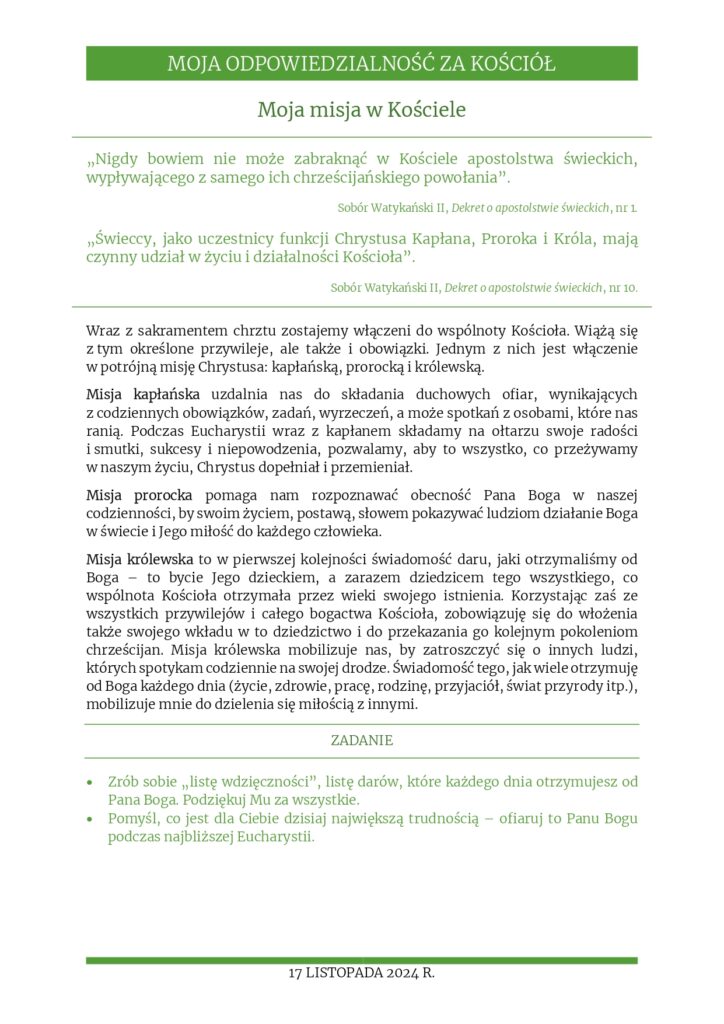 Rozważania na 17 listopada 2024 r. – „Moja misja w Kościele”