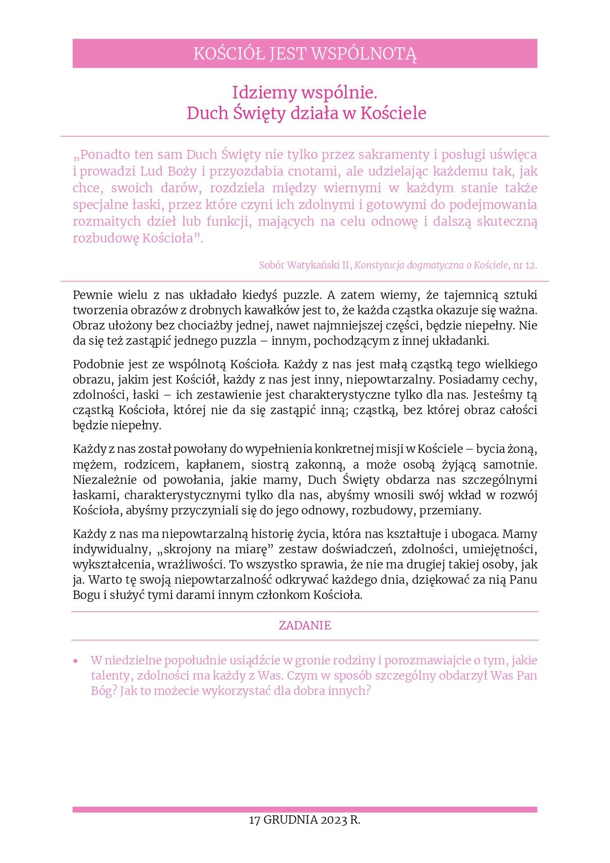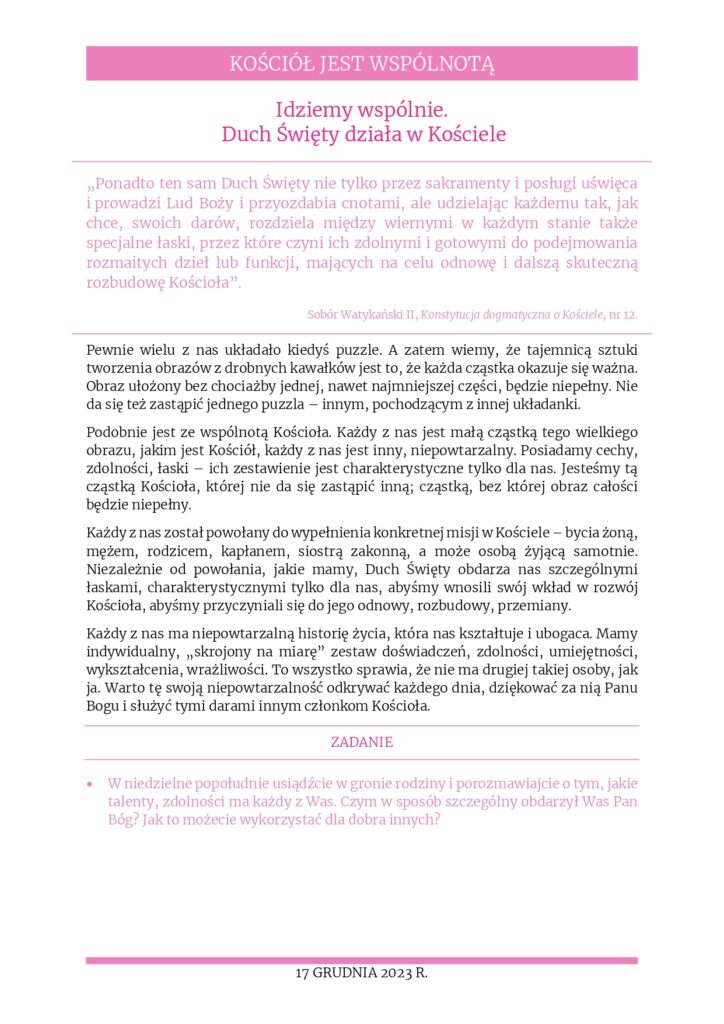 Rozważania na 17 grudnia 2023.r – „KOŚCIÓŁ JEST WSPÓLNOTĄ – Idziemy wspólnie. Duch Święty działa w Kościele”