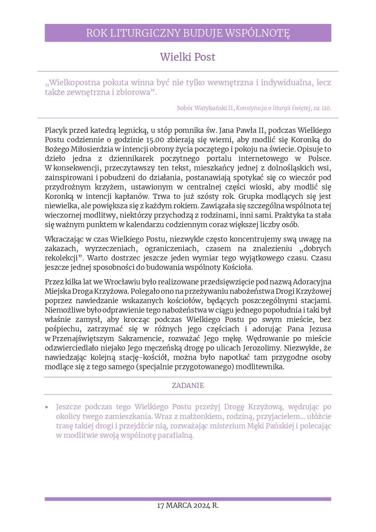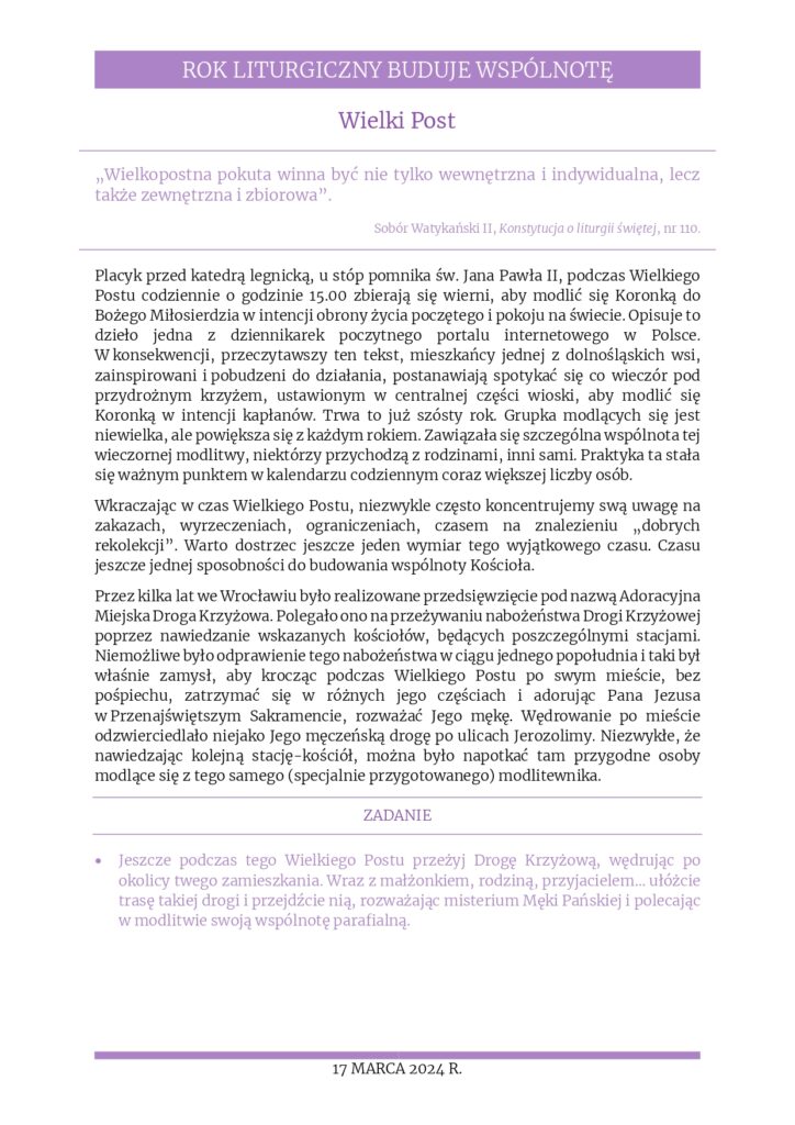 Aktualności, Poczta parafialna Poczta parafialna – rozważania na 17.3.2024 16 marca 2024 / Informacja przesyłana z Kurii Diecezjalnej, w której poruszane są różne ważne materiały związane z tegorocznym tematem duszpasterskim dla Polski o Kościele. Poniżej kolejny z takich materiałów, bardzo zachęcamy do lektury. Rozważania na 17 marca 2024 r. – „Wielki Post” 23_Materialy_dla_rodzin_17.03.2024Pobierz