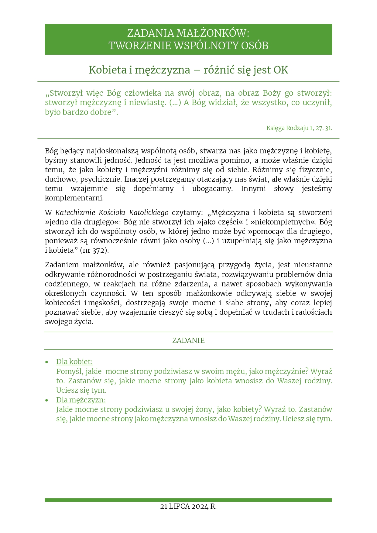 Rozważania na 21 lipca 2024 r. – „Kobieta i mężczyzna – różnić się jest OK”