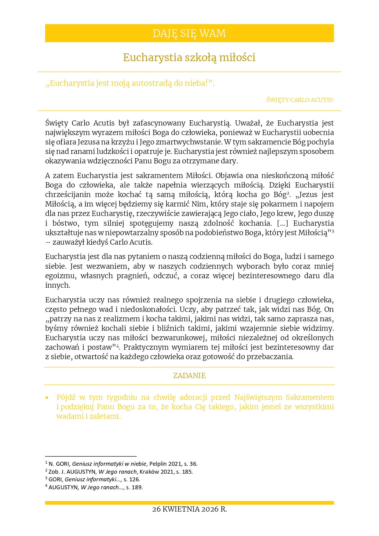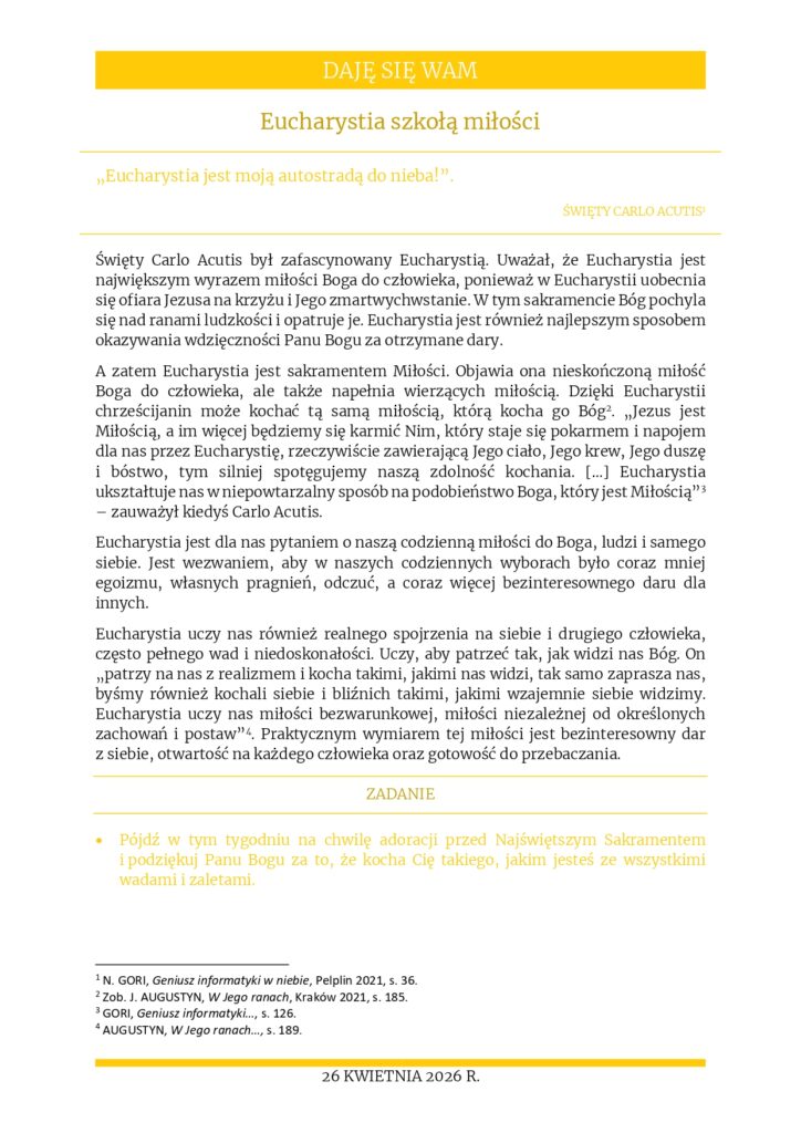Rozważania na 26 kwietnia 2025 r. – „Eucharystia szkołą miłości”