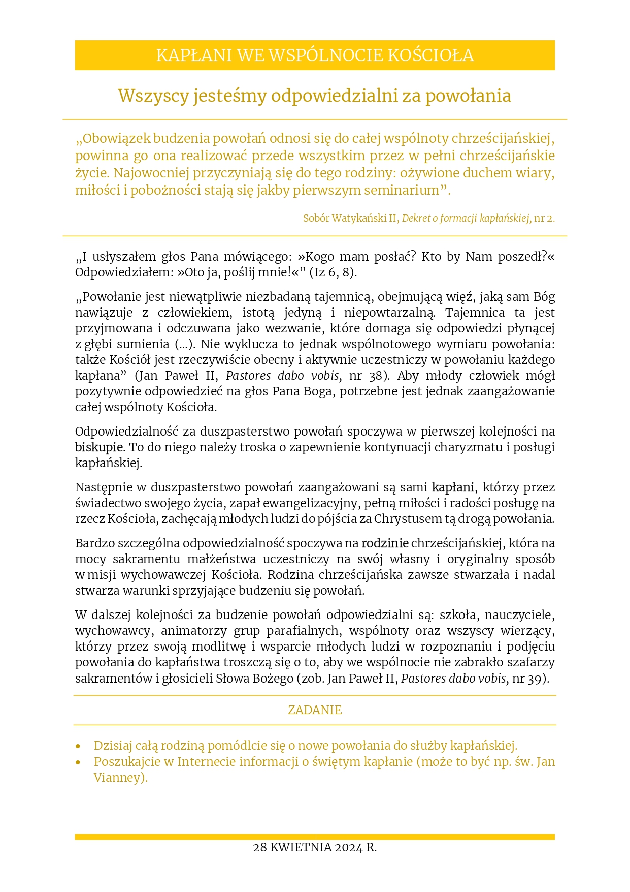 Rozważania na 28 kwietnia 2024 r. – „Wszyscy jesteśmy odpowiedzialni za powołania”