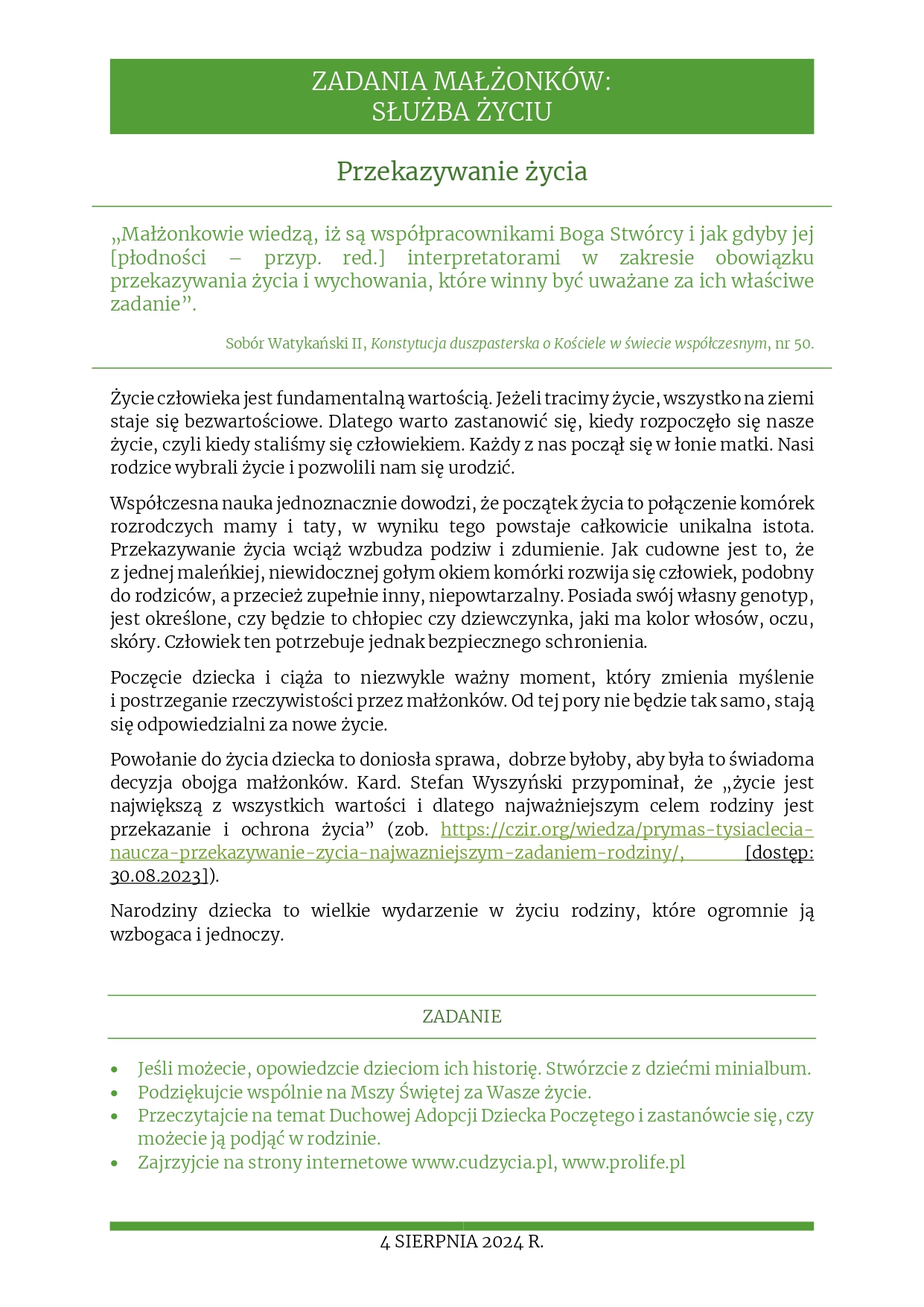 Rozważania na 4 sierpnia 2024 r. – „Przekazywanie życia”