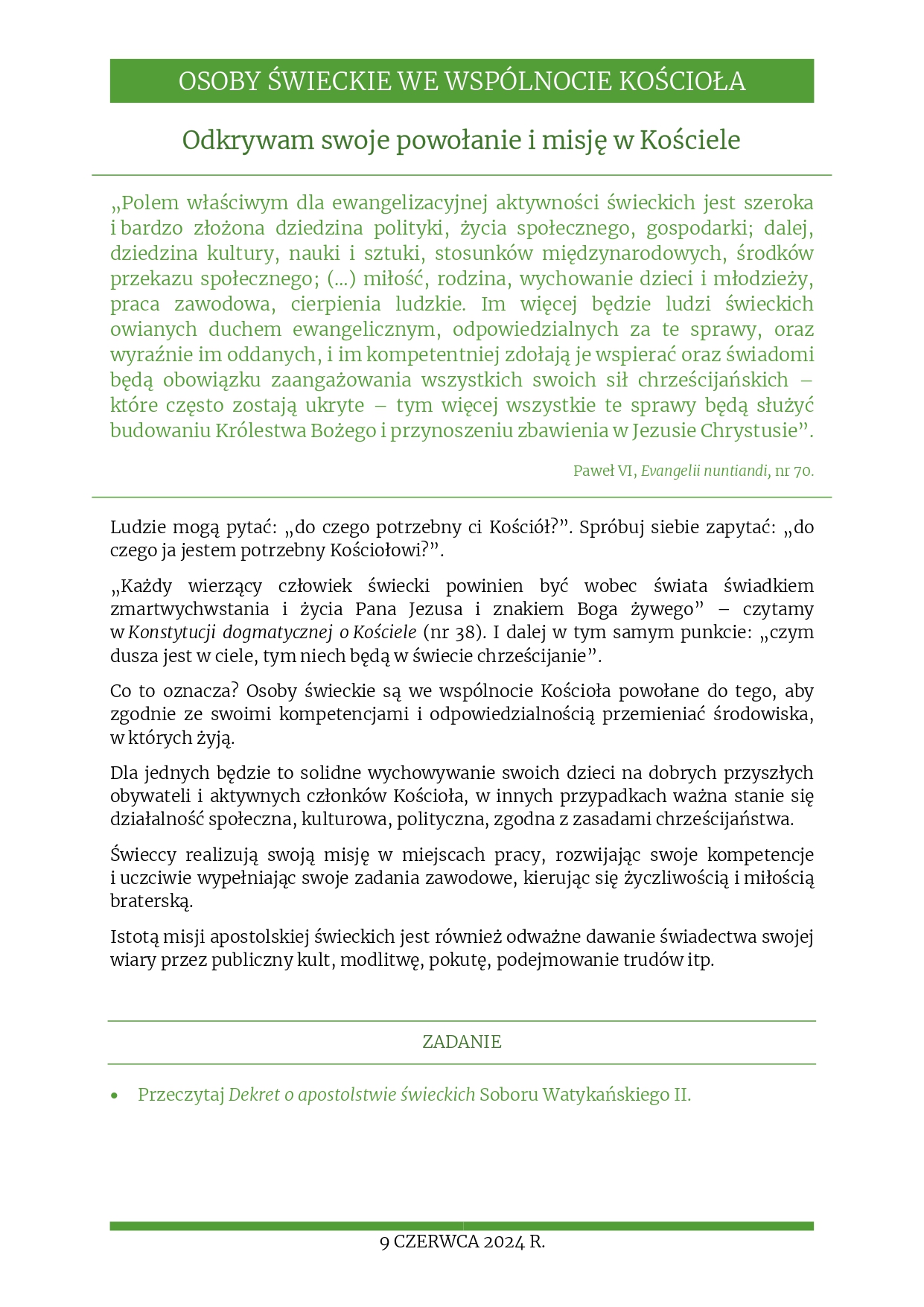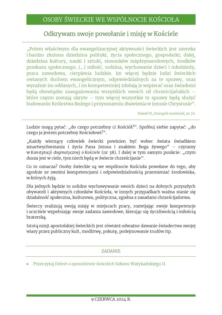 Rozważania na 9 czerwca 2024 r. – „Odkrywam swoje powołanie i misję w Kościele”